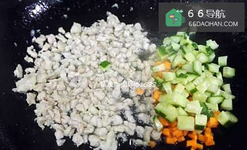 6放入胡萝卜和黄瓜一起翻炒几下。