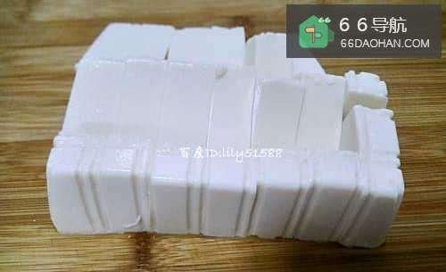 3将嫩豆腐轻轻地畜辞倒在案板上,切成大块备用。