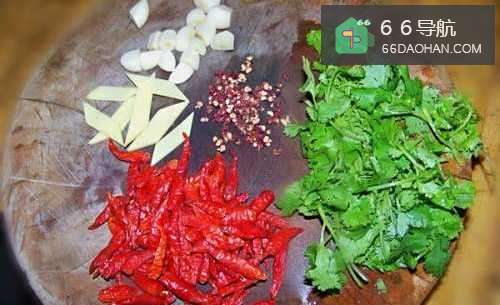 2生姜切块,蒜子切粒,干辣椒、花椒洗净晾干,香菜切小段待用