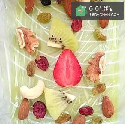 5最后放上一份干果,盖上保鲜膜,放冰箱冷藏3个小时即可。