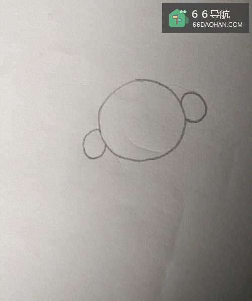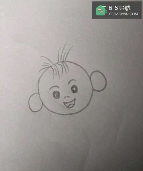 如图,首先画出大头儿子的头部,圆圆的大大的,接着画出两只大耳朵,两边要对称哦,头上的头发简单的画上几根就可以了。