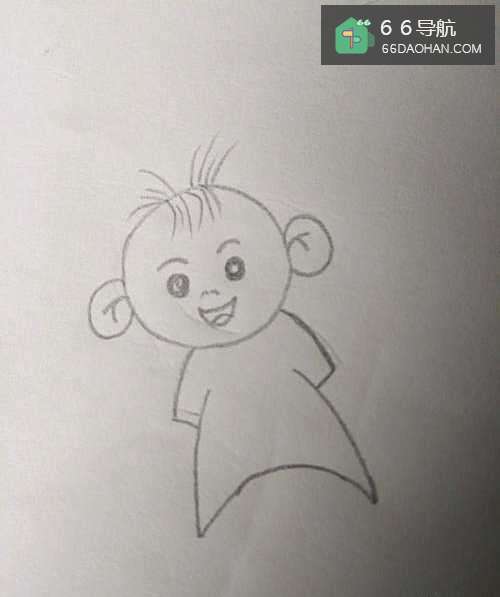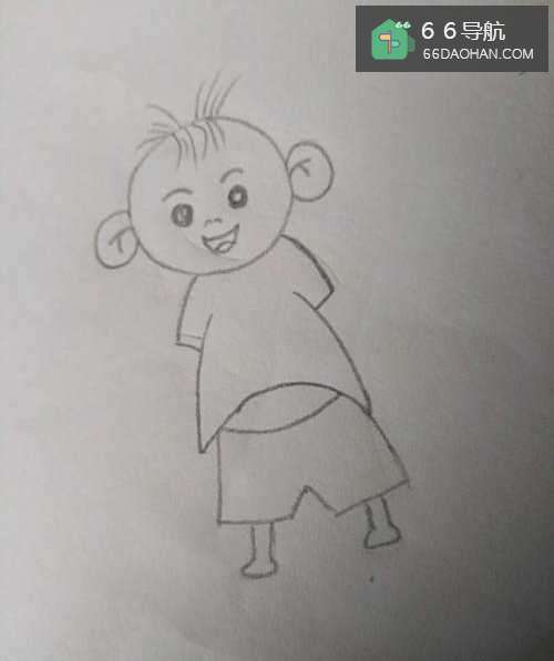 3如图,画出大头儿子宽松的上衣,下端画出一点弧度,这样很自然的。