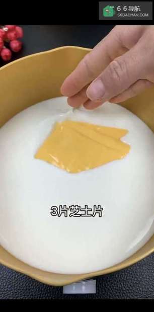 2锅中倒入250ml纯奶、20克白糖、3片芝士片,搅拌融化