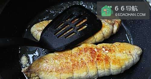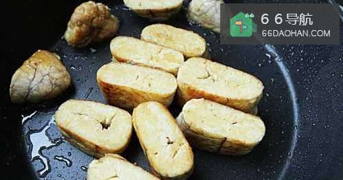 5把鱼籽放入锅内,煎鱼籽块的横切面,把里面大部分的水分都蒸发掉,煎好后的鱼籽块盛起备用;