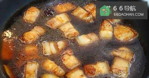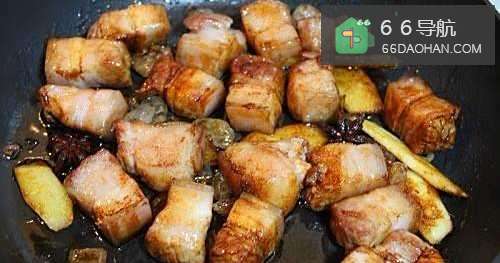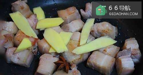 4煸炒至五花肉表面微黄,有油渗出时,将姜片和两个八角放入锅内煸炒出香味。