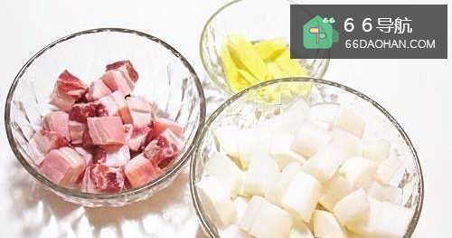 2将五花肉切块,白萝卜切块,姜切片备用。