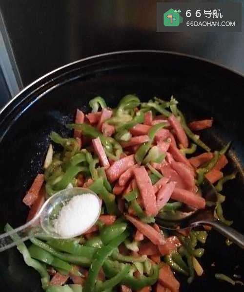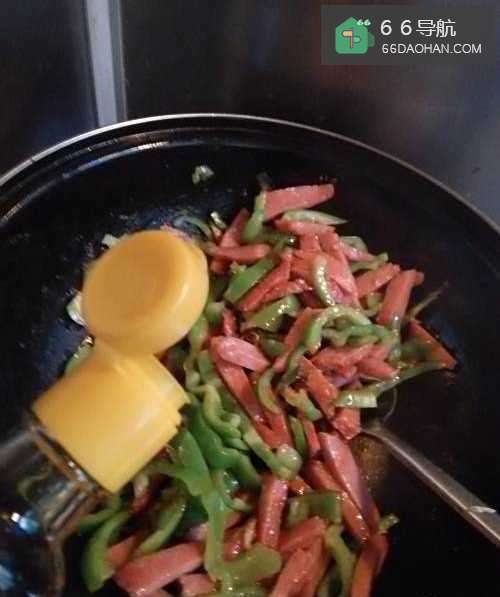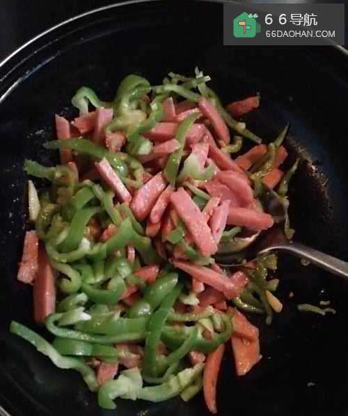 5再把甜椒丝倒进锅中,和火腿一起炒,翻炒均匀。