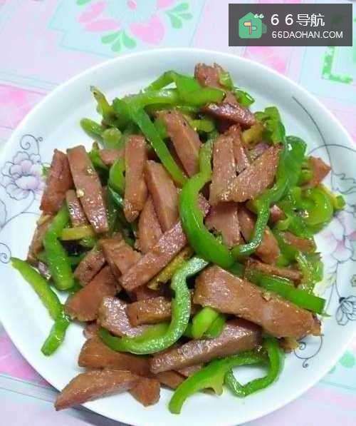 8将火腿和甜椒炒均匀,就可以出锅了,颜色翠绿,吃着又香又脆,特别好吃。