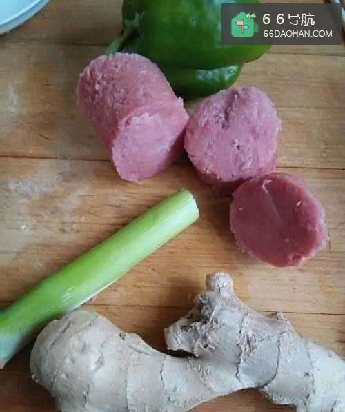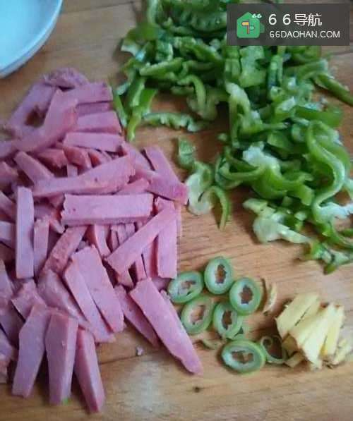 2将甜椒去掉籽和果柄,切成丝,将老火腿也切成细条,再将葱切成片,姜切成丝。