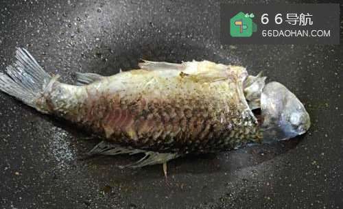 2鲫鱼去掉腹部的黑膜,清洗干净,用纸巾擦干水分,放入锅里煎至微黄。