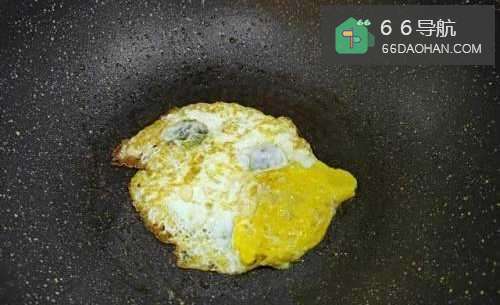 起锅烧热,放少许食用油,打入鸡蛋煎至两面金黄取出。