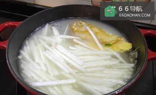 5鱼汤奶白,这时放入萝卜丝,保持锅里沸腾的状态,再煮8~10分钟,萝卜丝变软变透就可以了。