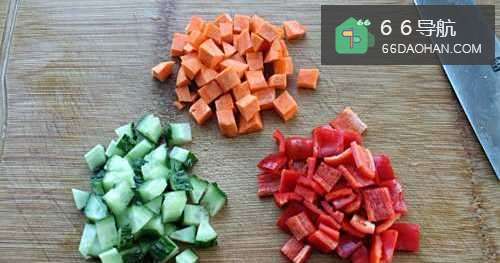3红椒、胡萝卜、黄瓜洗净切成丁块,姜和蒜切碎备用