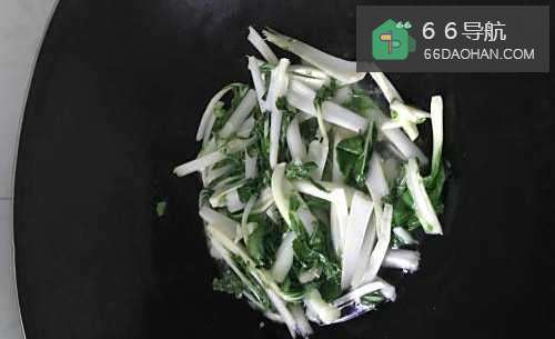 3炒锅烧热,放入油,倒入黑叶白菜,翻炒,黑叶白菜的水分会自己跑出来,菜叶会变软。