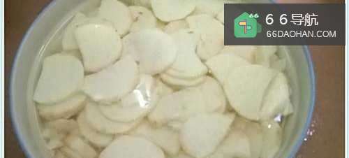 2将去皮的淮山切片备用(淮山表皮容易导致皮肤发痒,去皮时可以在淮山的一头套上干净的塑料袋).