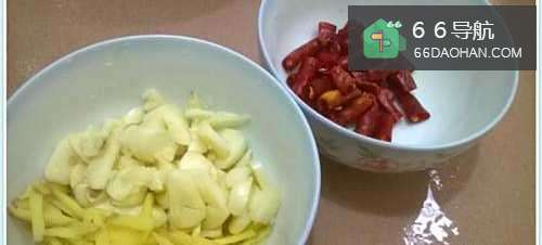 3将生姜切丝,大蒜切片,干红辣椒用剪刀剪成小段,备用.