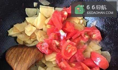 6此时,倒入切丁的西红柿,然后不停翻炒。