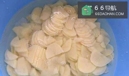 2然后把去了皮的土豆,切成片状,泡在水中,目的是去除一定量的淀粉。