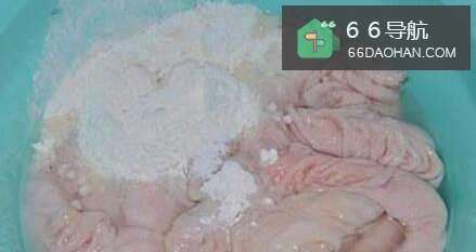 3在肥肠里加上盐、面粉反复搓洗,直搓到有大量胶液产生为止。