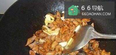 5锅中倒油加上姜蒜辣椒炒至有香味时放入大肠。