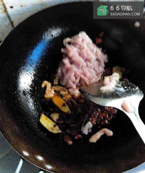 3因为油烧旺了,放入以后要马上翻炒(炒糊了炒好后的菜会成深色,所以要自己掌握好)。