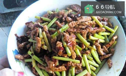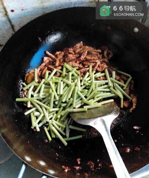 5肉炒的8分熟后放入切好的蒜苔,继续翻炒,13分钟就可以出锅了(需要自己衡量)。