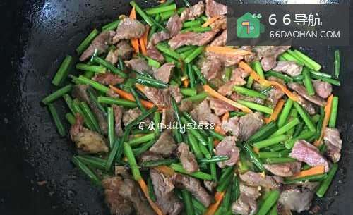 6将胡萝卜和韭菜花一起放入锅里,用大火快速翻炒。