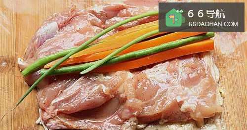 5腌制好的鸡肉铺开,把比较厚的肉层用刀把肉片薄一点,片出来的肉可以铺在肉层比较薄的地方,反正就是使整片鸡肉比较均匀,放上豆角,胡萝卜和葱段;