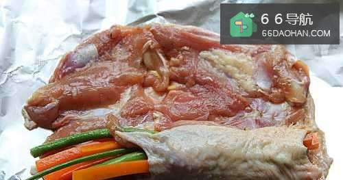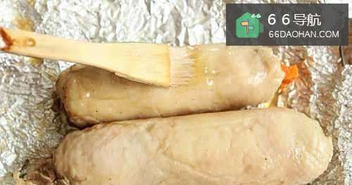 6放置锡纸下端,先将鸡肉卷起,再卷锡纸;