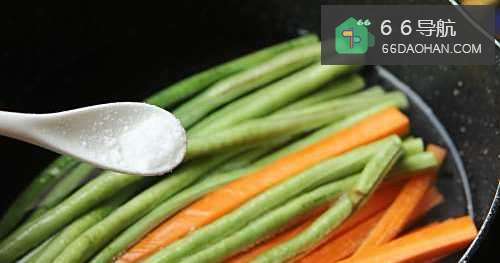 4把胡萝卜切成条,豆角切成和胡萝卜一样长,锅里放一点盐,煮4分钟后捞起备用;