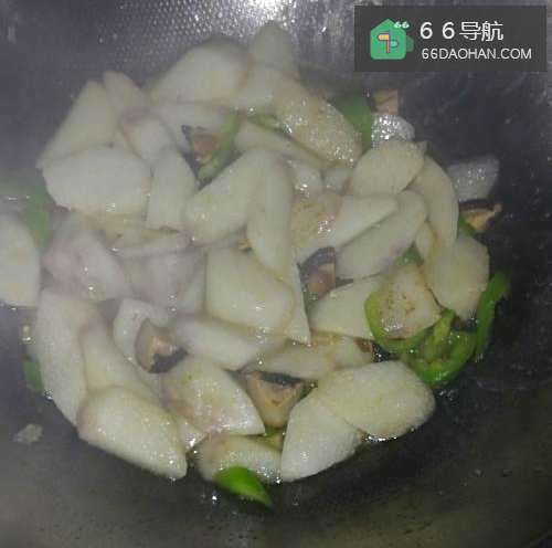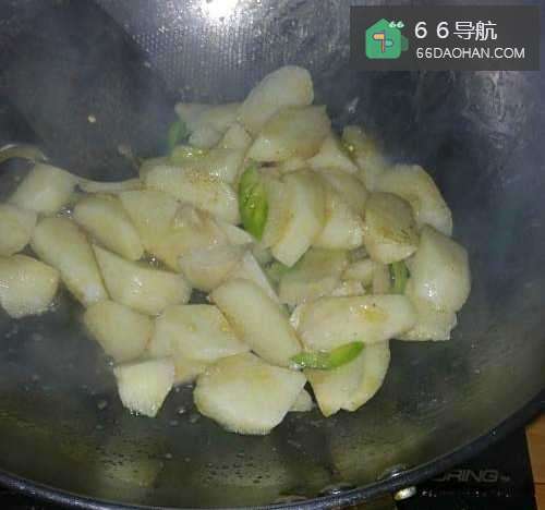 2锅底油适量,烧热后倒入青椒和山药,翻炒后,倒适量料酒。