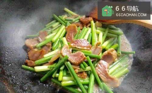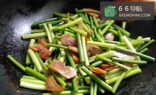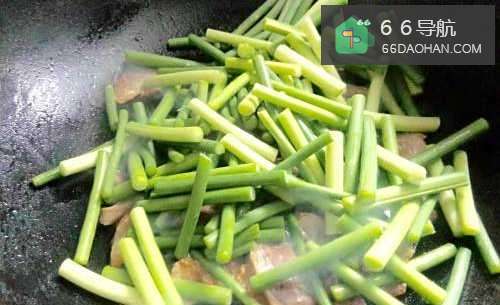 5腊肉炒变色之后,香味也出来了,就可以把洗干净沥干水分的蒜薹段倒进锅里面了。