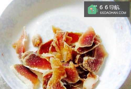 2然后将腊肉用温水洗一遍,切成薄片放在盘子里备用。