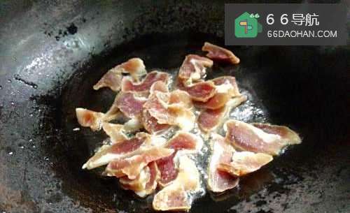 4然后转中火将腊肉煸香,炒至腊肉变色,香味溢出即可。