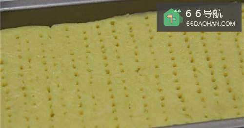 3面团取出放入保鲜袋擀开擀均匀,铺入磨具内(大小跟模具相同,不要擀得太厚),然后用叉子扎孔,防止烤的时候鼓起(如图)。