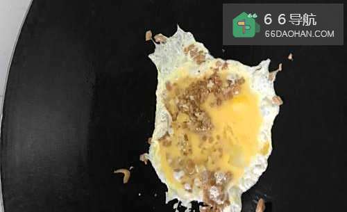 4接着把鸡蛋液倒入,摊开凝固后,翻一面煎。