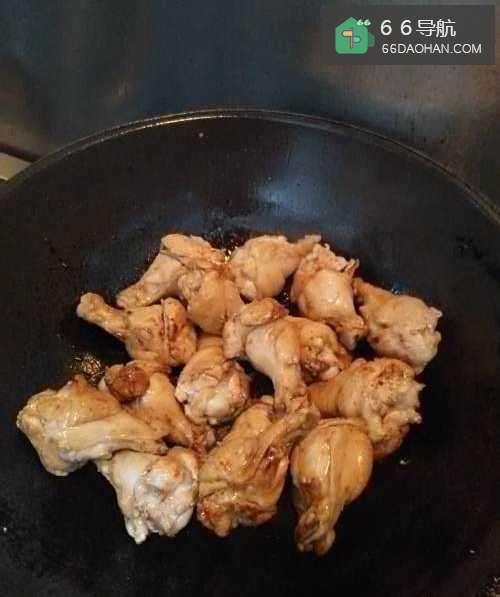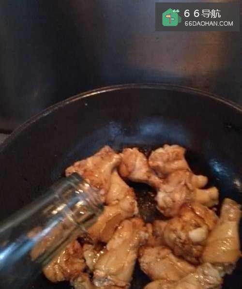 6当翅根全部变成红色后,将葱、姜、大料放入锅中煸炒一下,然后倒入适量的料酒。