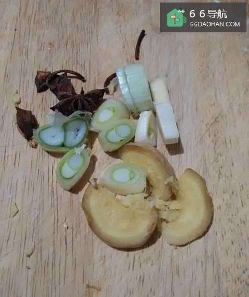 2准备葱、姜、大料,葱和姜切成片待用,大料分成小块。