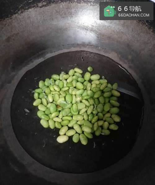 5韭菜炒至7成熟,倒入煮熟的毛豆,再次翻炒,直至成熟
