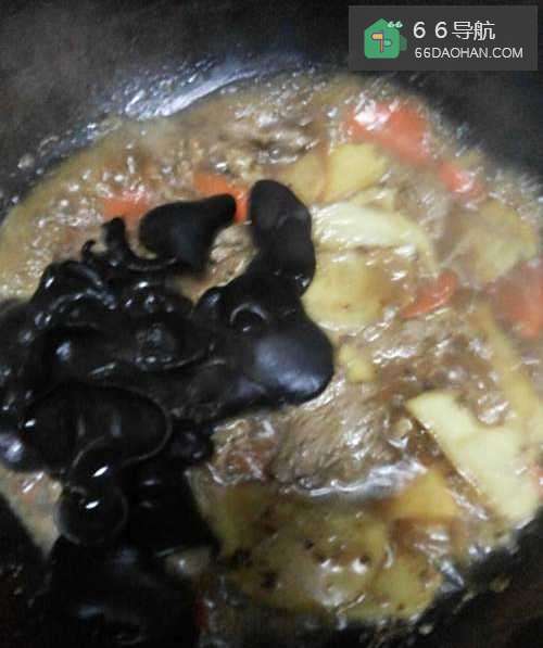 6倒入少许水,放上发好的木耳,盖上锅盖炖一会。