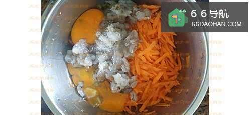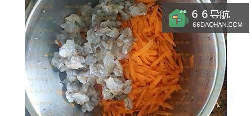 3将虾切小丁,与胡萝卜放一起。
