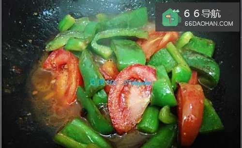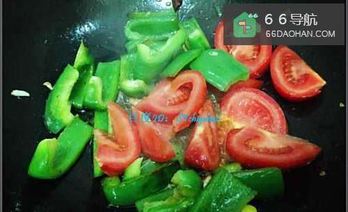 5待青椒有七八分熟之后倒入前面切好的西红柿瓣,然后大火翻炒一会。