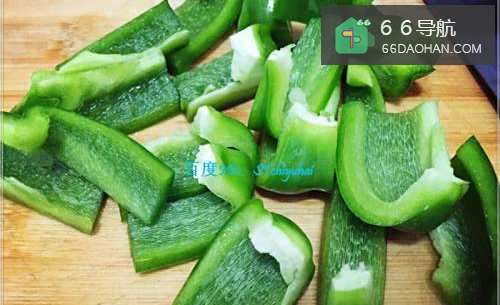 3将青椒先竖直切成条状,然后再横切,将其切成块状。