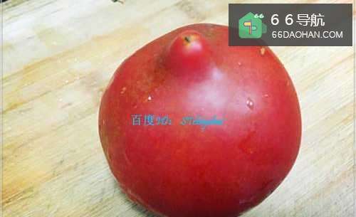 准备一个西红柿,将西红柿清洗干净,然后对半切开,剜去蒂头部分,然后沿着竖直方向切成小瓣状。