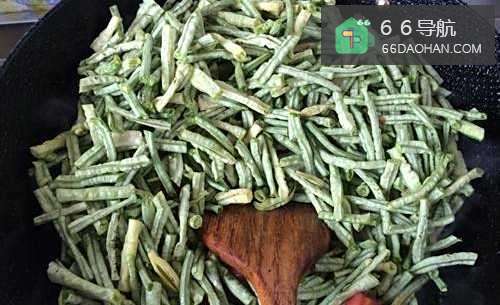 带豆角变色后,加入盐、味精等调料,即可关火出锅。