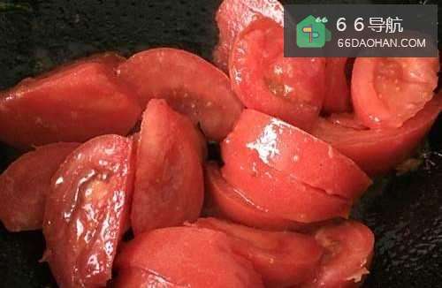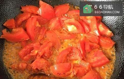 5开火加油后,首先炒番茄,加入适量白开水,然后盖上锅盖,使番茄轰烂出汁。