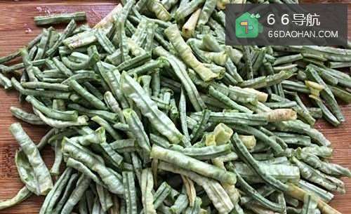2然后把老豆角切成手指关节长短的小段,装盘备用。