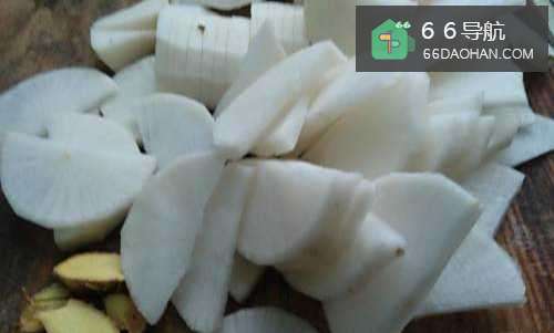 2将去皮的白萝卜切成薄片状,再切5片生姜。