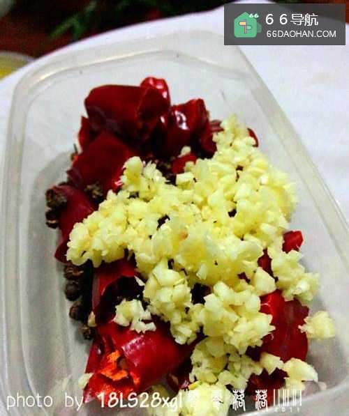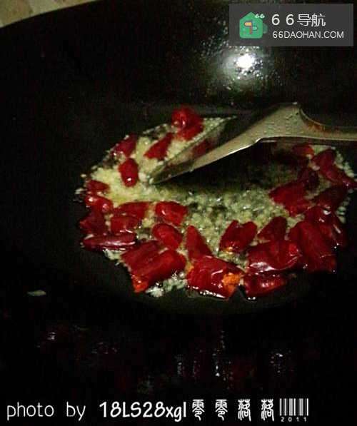 5热锅里重新倒油,将干红辣椒碎、花椒、蒜末倒进锅里,小火炒香;