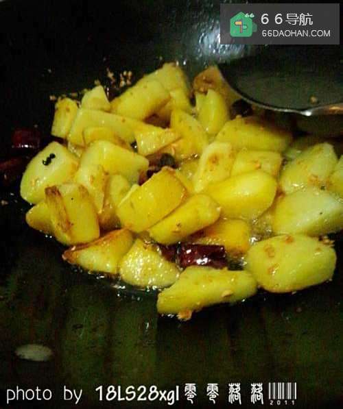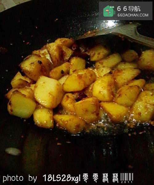 8待土豆入味时,撒干辣椒粉,花椒粉,调入鸡精,翻炒均匀即可出锅。